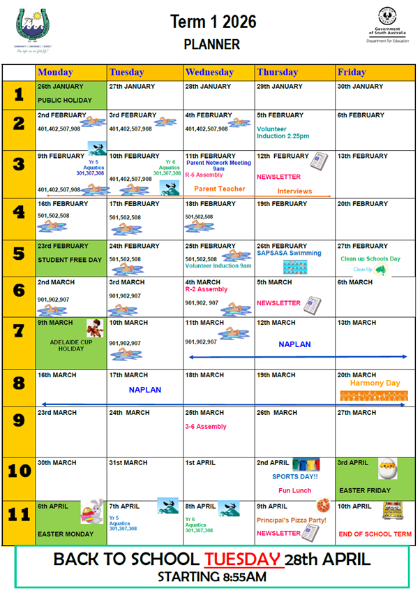 Term 1 Planner Tuesday 27 January 2026 11:00 am 12:00 pm 11:00 12:00 Port Elliot Primary School 4Cameron Street Port Elliot Australia (map) Google Calendar ICS