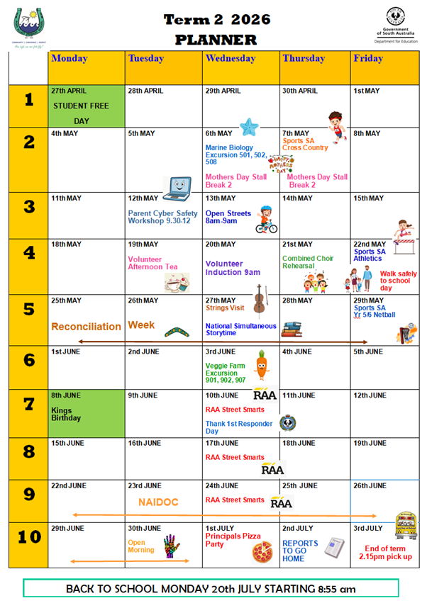 Term 2 Planner Wednesday 29 April 2026 1:00 pm 13:00 Friday 3 July 2026 2:00 pm 14:00 Port Elliot Primary School 4Cameron Street Port Elliot Australia (map) Google Calendar ICS